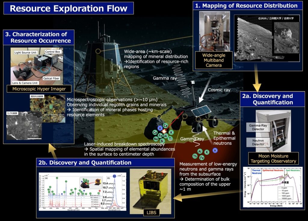 The research team will develop four observation instruments designed to measure the concentration and mineral composition of elements on the lunar surface. These instruments include a wide-angle spectroscopic camera, neutron and gamma-ray sensors, a laser-induced plasma emission spectrometer (LIBS), and a microscopic spectroscopic camera. By combining these technologies, the project aims to identify resource elements, evaluate their abundance, and determine how they are incorporated into lunar minerals.